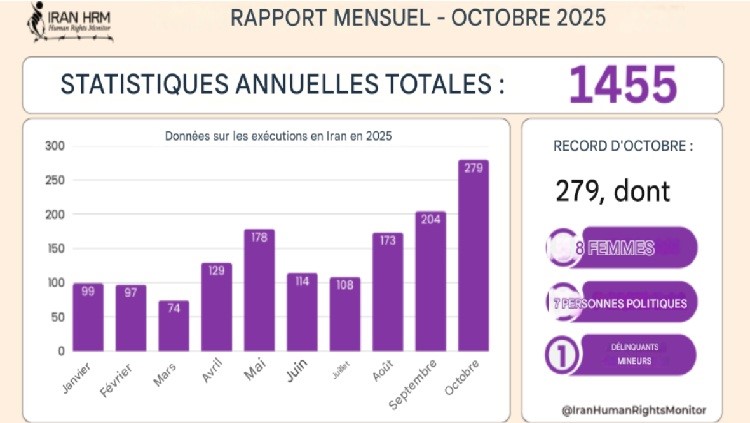 En novembre 2025, au moins 260 prisonniers ont été exécutés dans les prisons iraniennes, soit une augmentation de 106 % par rapport à novembre 2024, marquant le nombre mensuel le plus élevé enregistré en Iran depuis vingt ans. La majorité des exécutions sont restées non annoncées officiellement, certaines ayant été réalisées en secret sans prévenir les familles. Parmi les prisonniers exécutés, 43 étaient Lor, 35 Kurdes, 22 Turcs et 13 Arabes, soulignant la présence de minorités ethniques parmi les victimes. En Iran, la peine de mort est un outil central de domination, de répression et de terreur d'Etat...