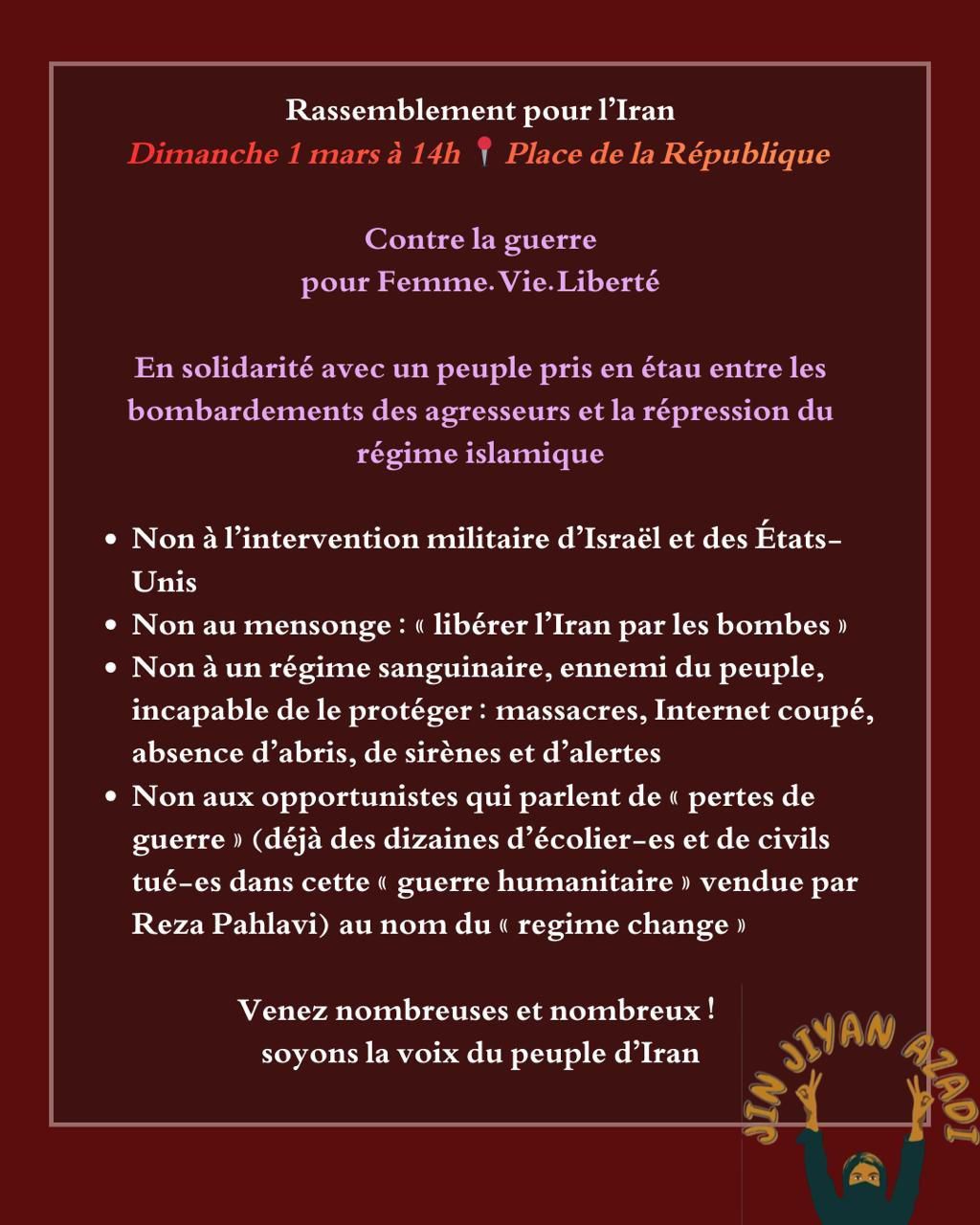 Organisé par : Azadi4Iran, Iran Justice, Roja Soutenu par : Feminist4Jina, Ligue des femmes iraniennes pour la démocratie, Association des Kurdes résidant en France, AVA, Conseil démocratique-Paris (Pour le soutien aux mouvements populaires en Iran), SSTIAvec le soutien de Le Collectif syndical pour l’Iran (CFDT, CGT, UNSA, FSU et Solidaires), LDH, LFI, NPA, PCF, LO, L'Après